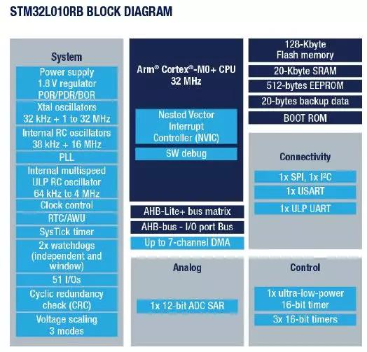 STM32L0x0 內(nèi)置高達 128 KB 的 Flash、高達 20 KB 的 RAM 和高達 512 字節(jié)的片內(nèi) EEPROM。